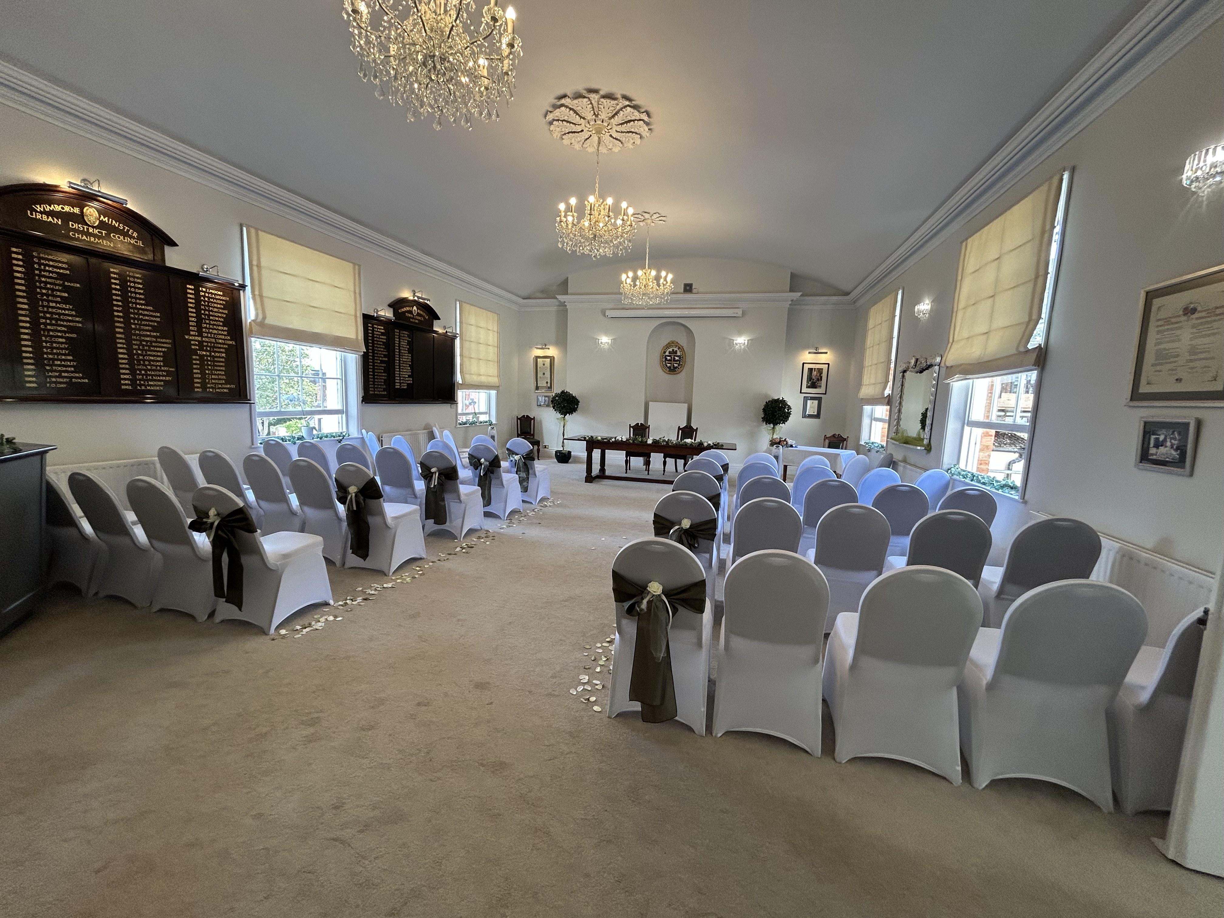 Built in the 19th Century, the elegant Council Chamber situated within the Grade II listed Town Hall is licensed for Civil Ceremonies. The Council Chamber has been licensed since 1996 and has grown in popularity over the years to become one of the most popular venues in East Dorset. It underwent a sympathetic refurbishment at the beginning of 2020 to make the most of its period features – including a barrel-vaulted ceiling adorned with large chandeliers.