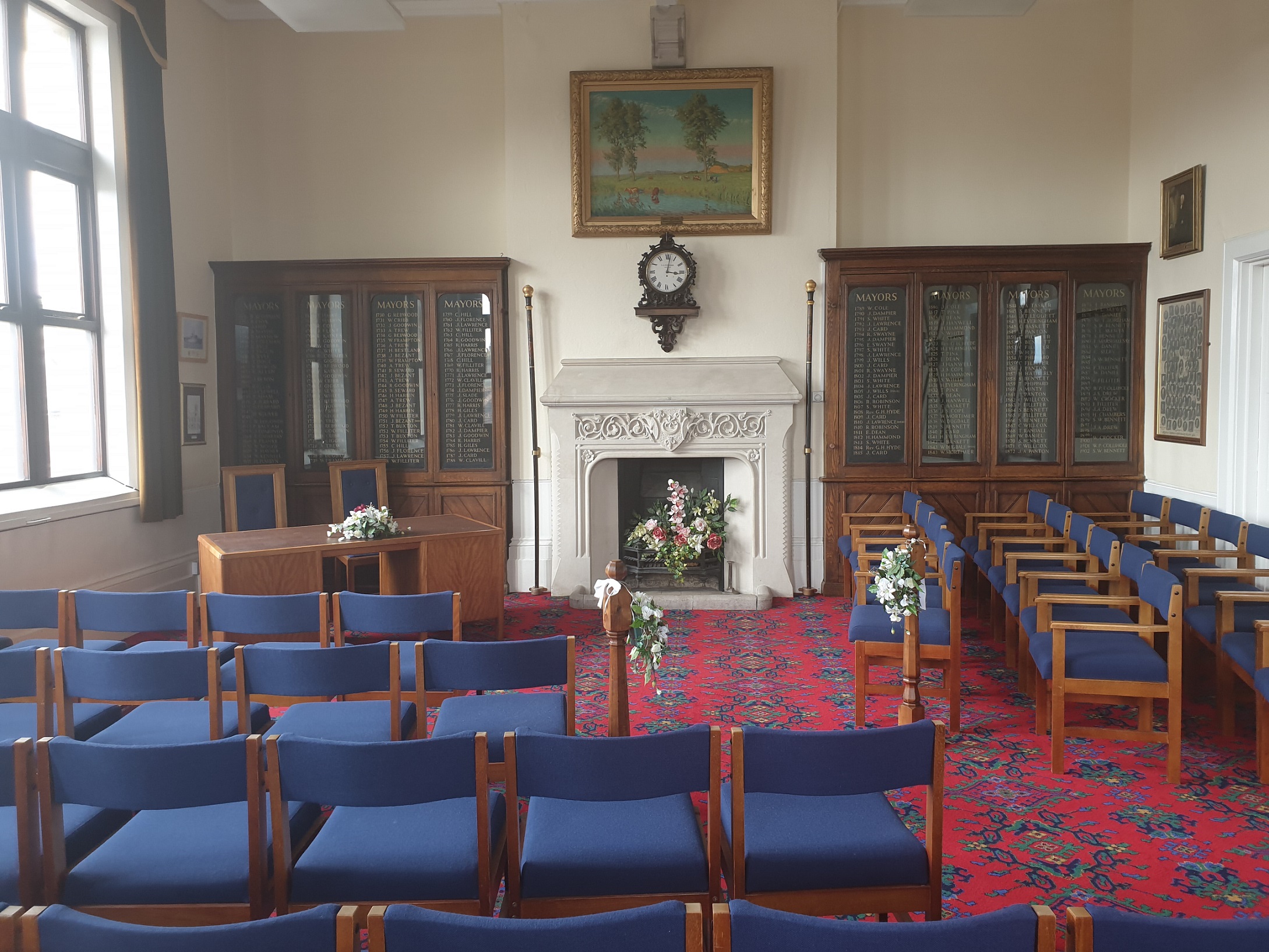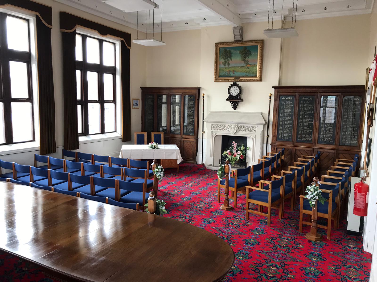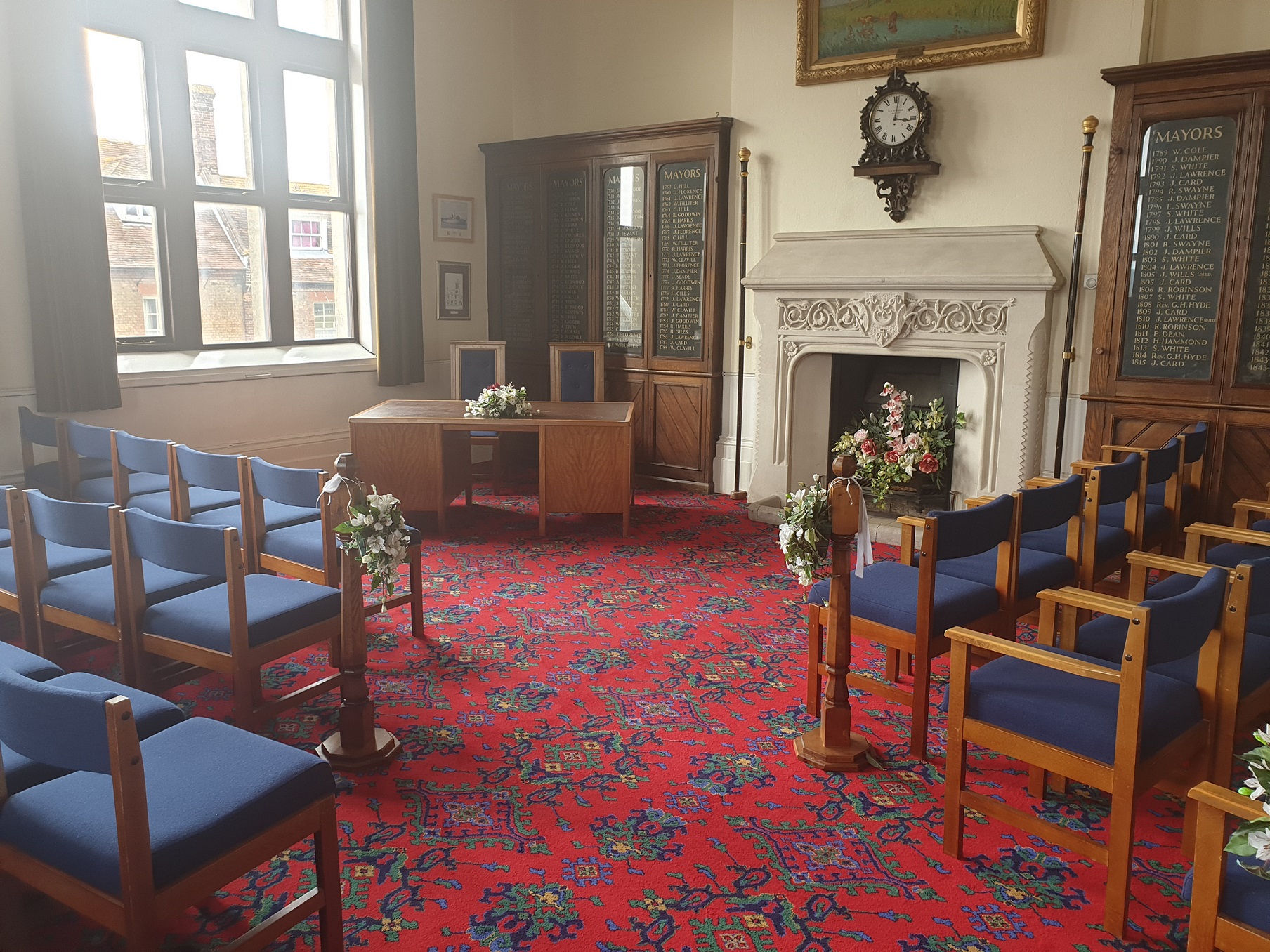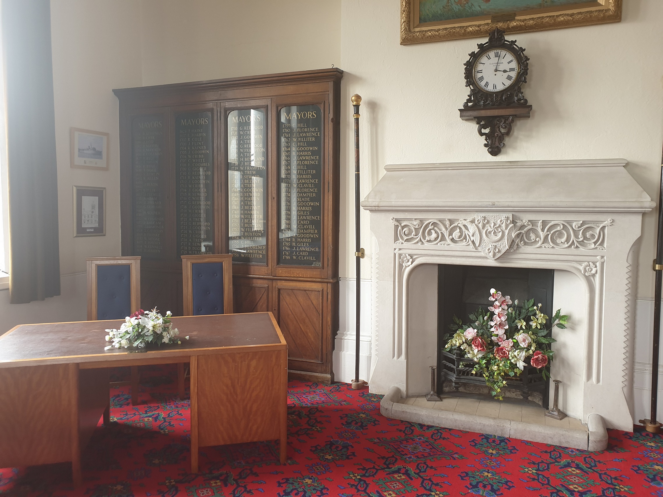 Wareham's Victorian Town Hall stands on the site of the medieval church of St Peter. With hints of French provincial influences in its styling, it contrasts strikingly with the predominantly Georgian buildings around it. The council chamber has a splendid carved stone fireplace, and the names of mayors from the 14th Century adorn the walls.