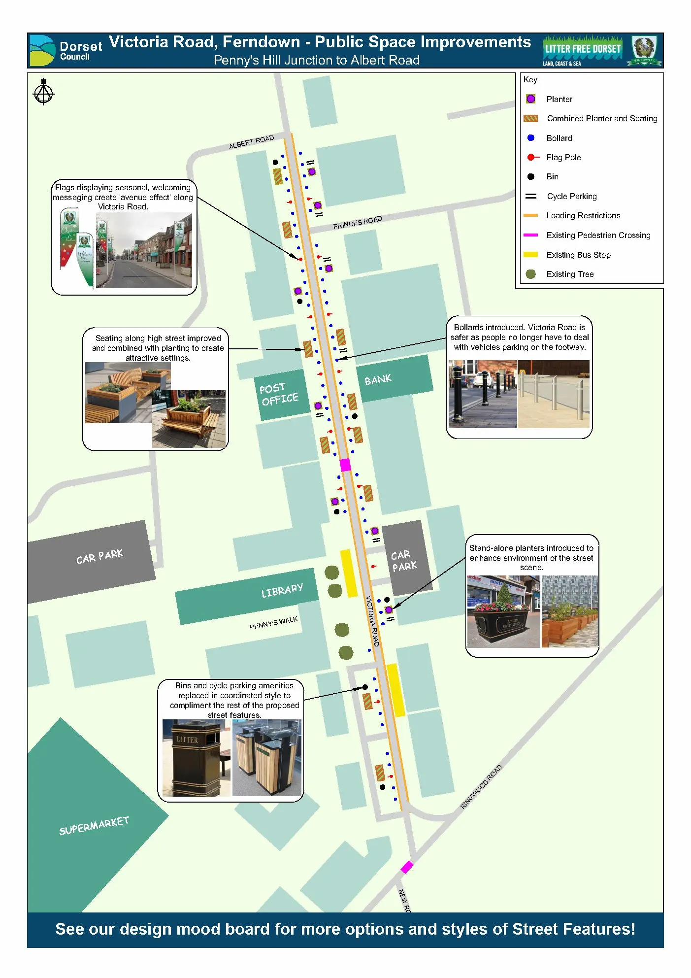 - from 15 October to 15 November 2025, residents shared their views on the proposals below through a survey and at 4 in-person events held at the Barrington Centre. They were asked to give their preferences on styles of street furniture. The results will be published on Ferndown Town Council's website in December 2025.