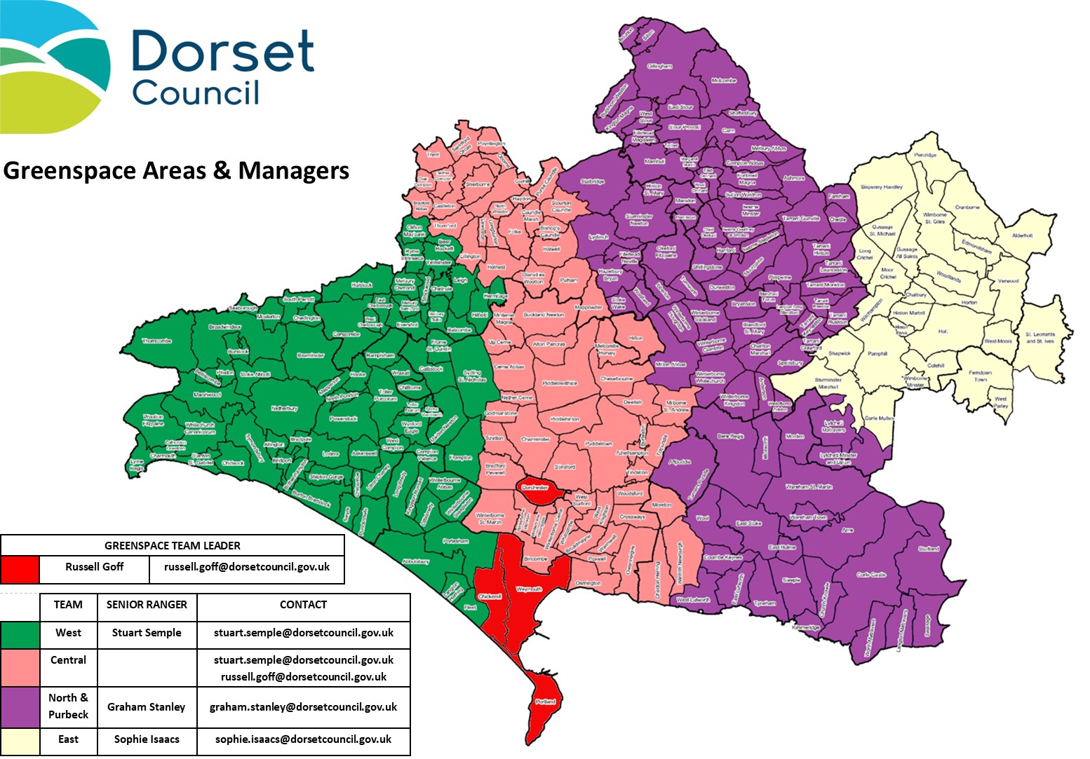 Check the Greenspace areas and manager's map to find out the correct ranger for a specific area of Dorset.